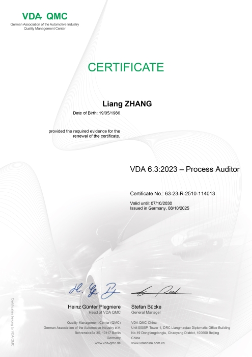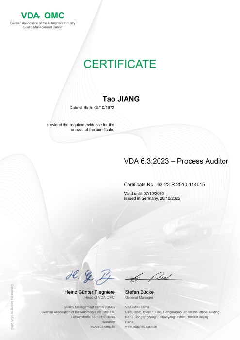 VDA6.3作为德国汽车工业质量管理的核心标准,是进入全球高端汽车供应链的“通用语言”。时博(中国)工业始终紧跟国际标准发展,早在2022年便邀请南德认证资深讲师为质量团队开展VDA6.3过程审核培训,相关人员通过考试并取得证书。2023年,VDA6.3新版标准发布,并于2024年正式实施,为确保持续符合最新标准要求,公司迅速组织并推进证书更新工作。在此过程中,公司工程师向VDAQMC提交了系统化的能力证明材料,充分展现了在过程审核领域的专业积累与实践成果。经VDAQMC严格审核,公司工程师顺利通过评审,不仅完成了证书延期,也同步更新至最新版本标准。这标志着时博(中国)工业在质量管理体系建设与人才能力发展上,持续与国际先进水平保持同步。